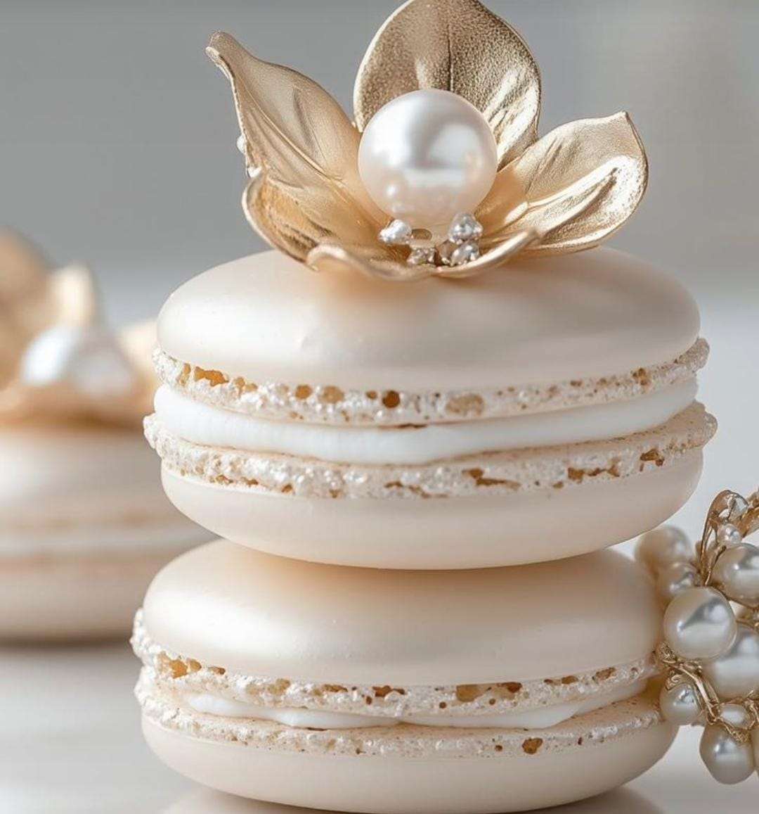 🤍 Macarons Blancos Elegantes con Perla y Hoja Dorada